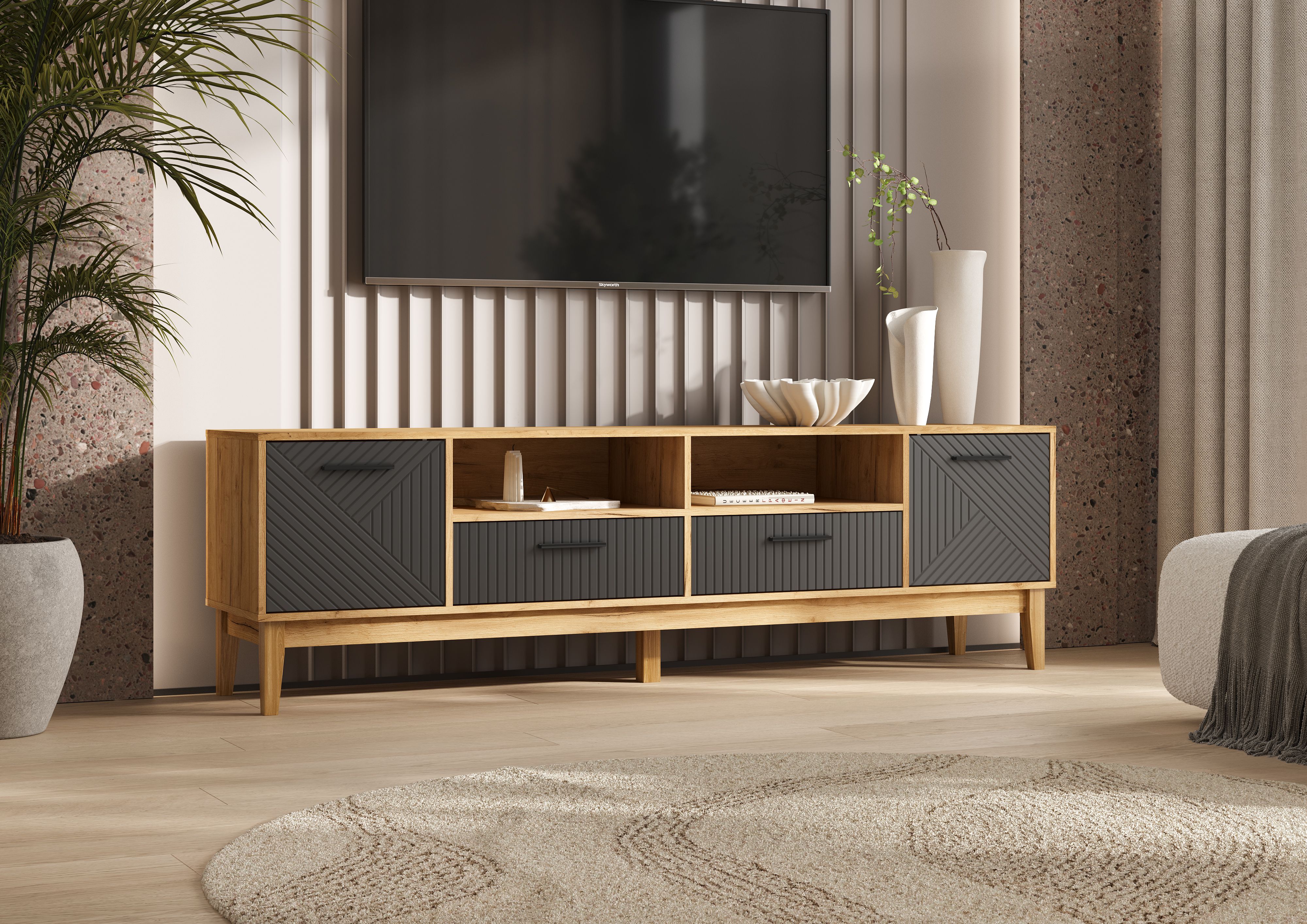 Флэш Тумба ТВ 2 двери 2 ящика (Браш Графит, Дуб Крафт )