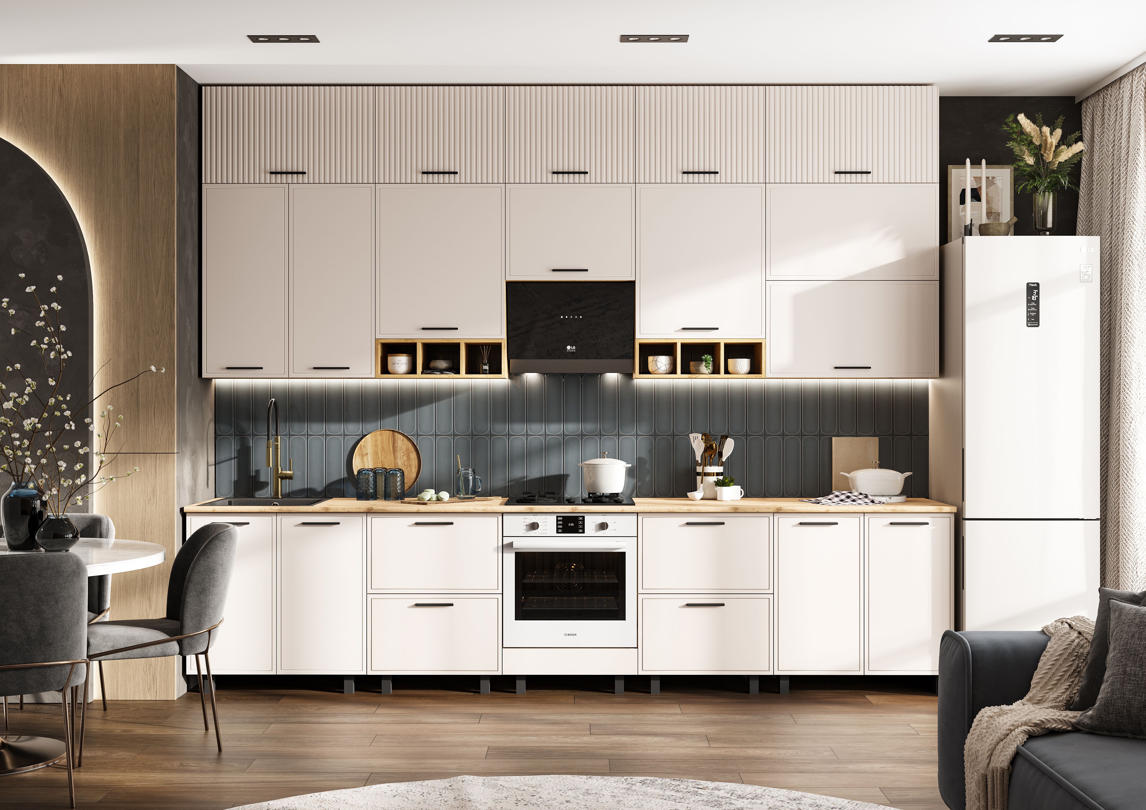 Стеновая панель (фартук), мойка, цоколь, карниз, подсветка, бытовая техника в стоимость кухонного гарнитура не входят и приобретаются дополнительно.
