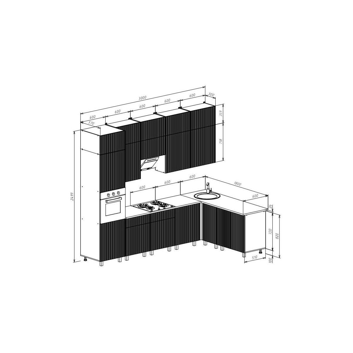 Высота нижних модулей указана с учетом столешницы.