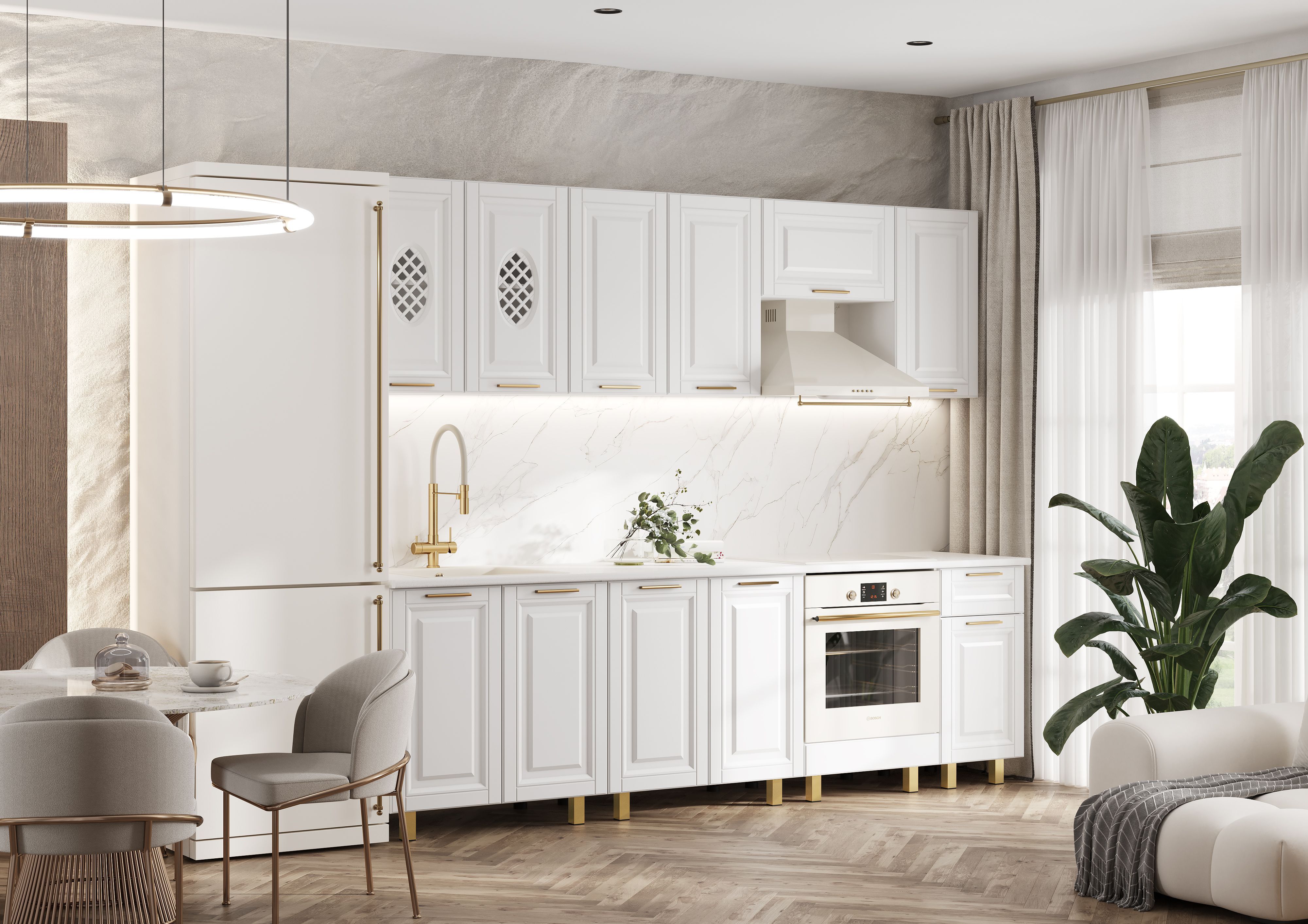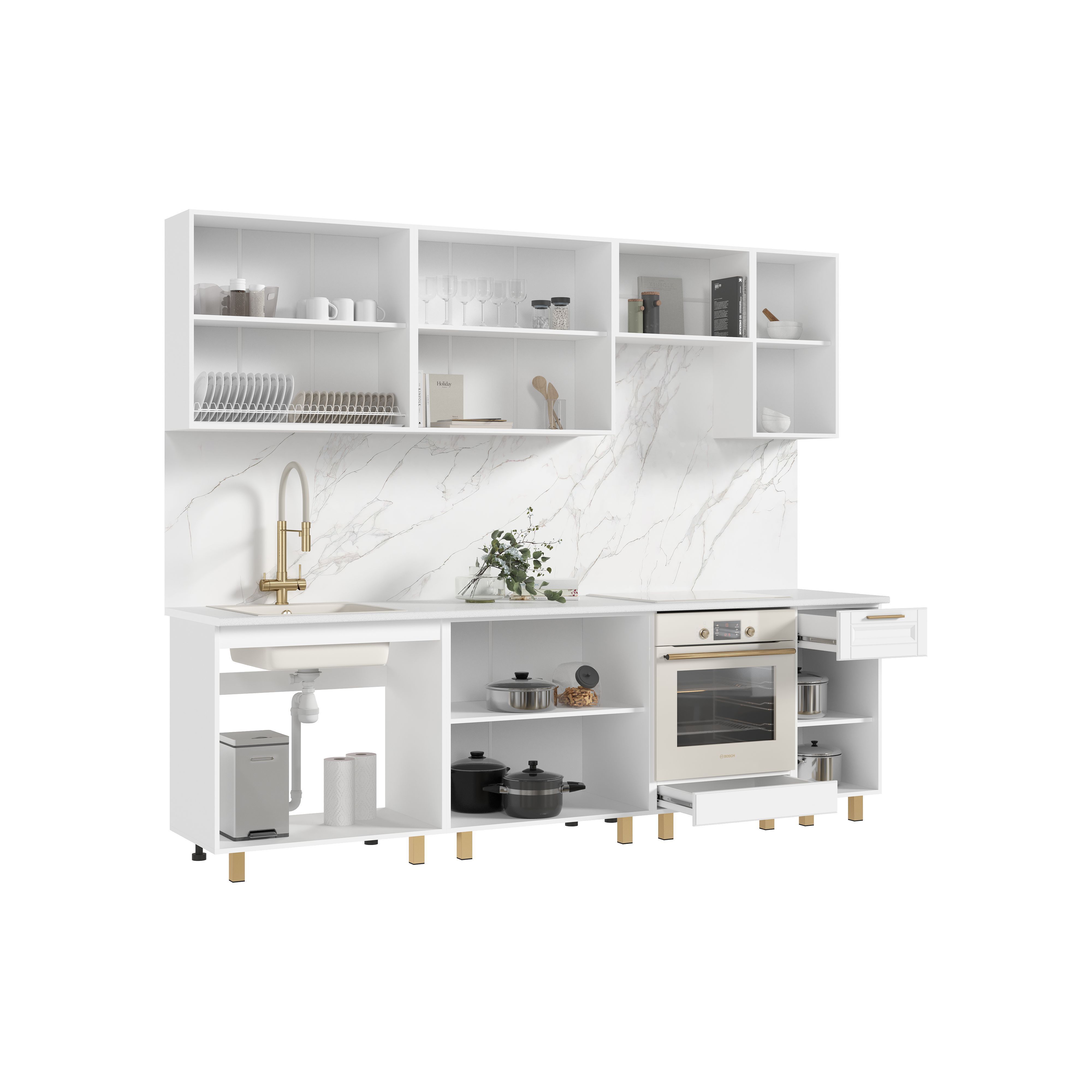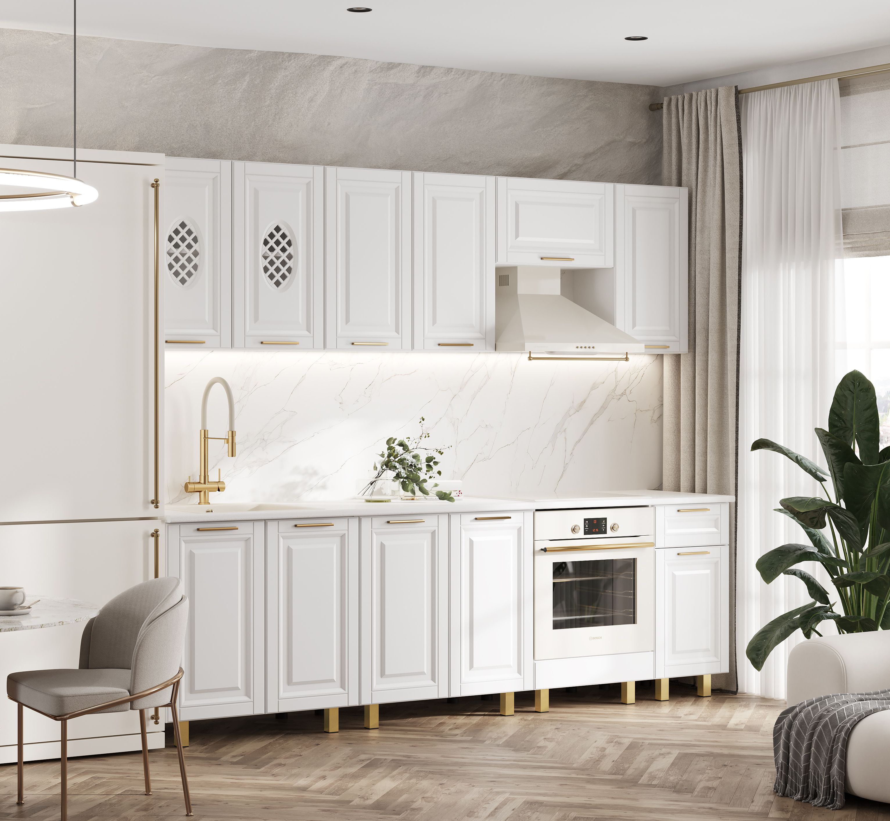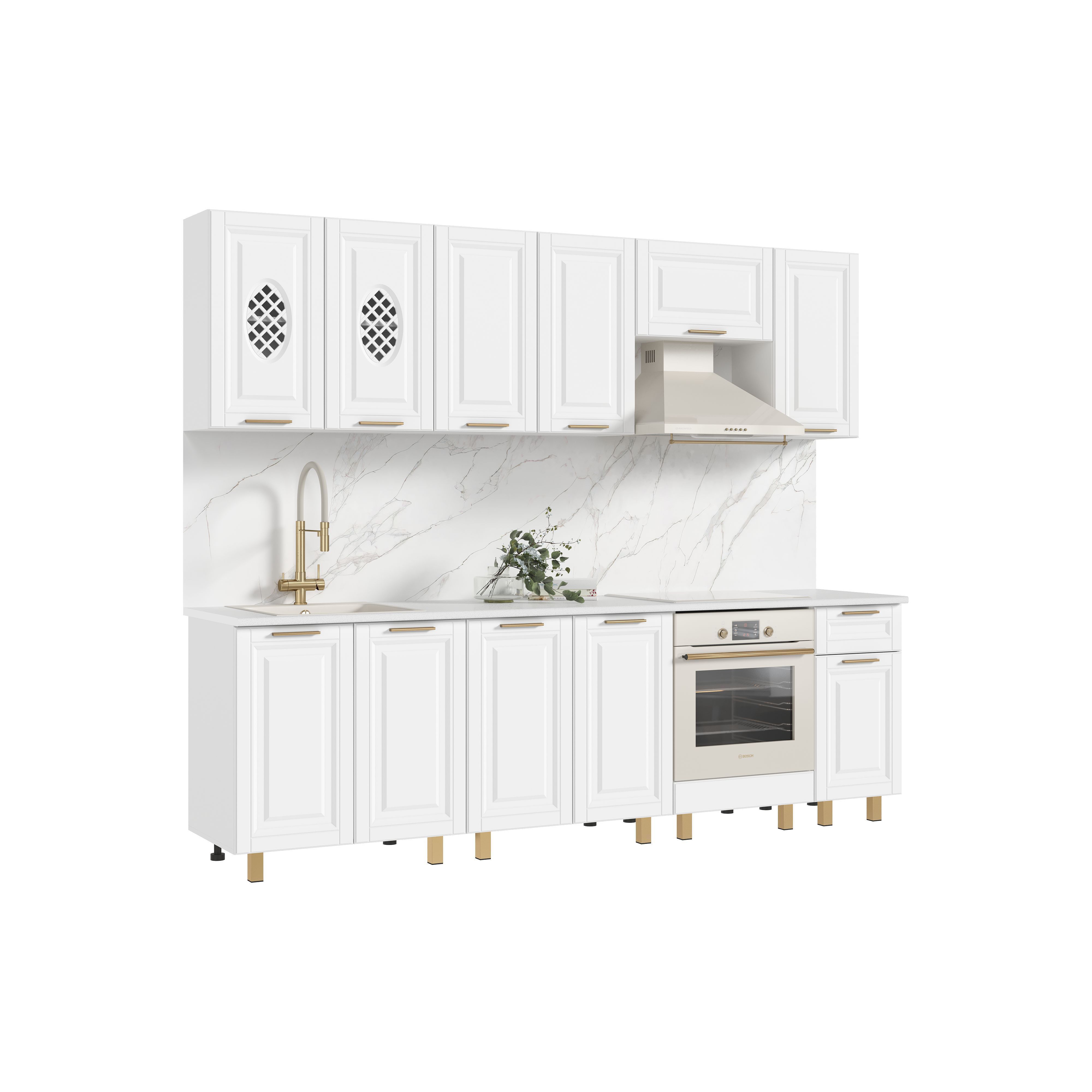 Стеновая панель (фартук), мойка, цоколь, карниз, подсветка, бытовая техника в стоимость кухонного гарнитура не входят и приобретаются дополнительно.