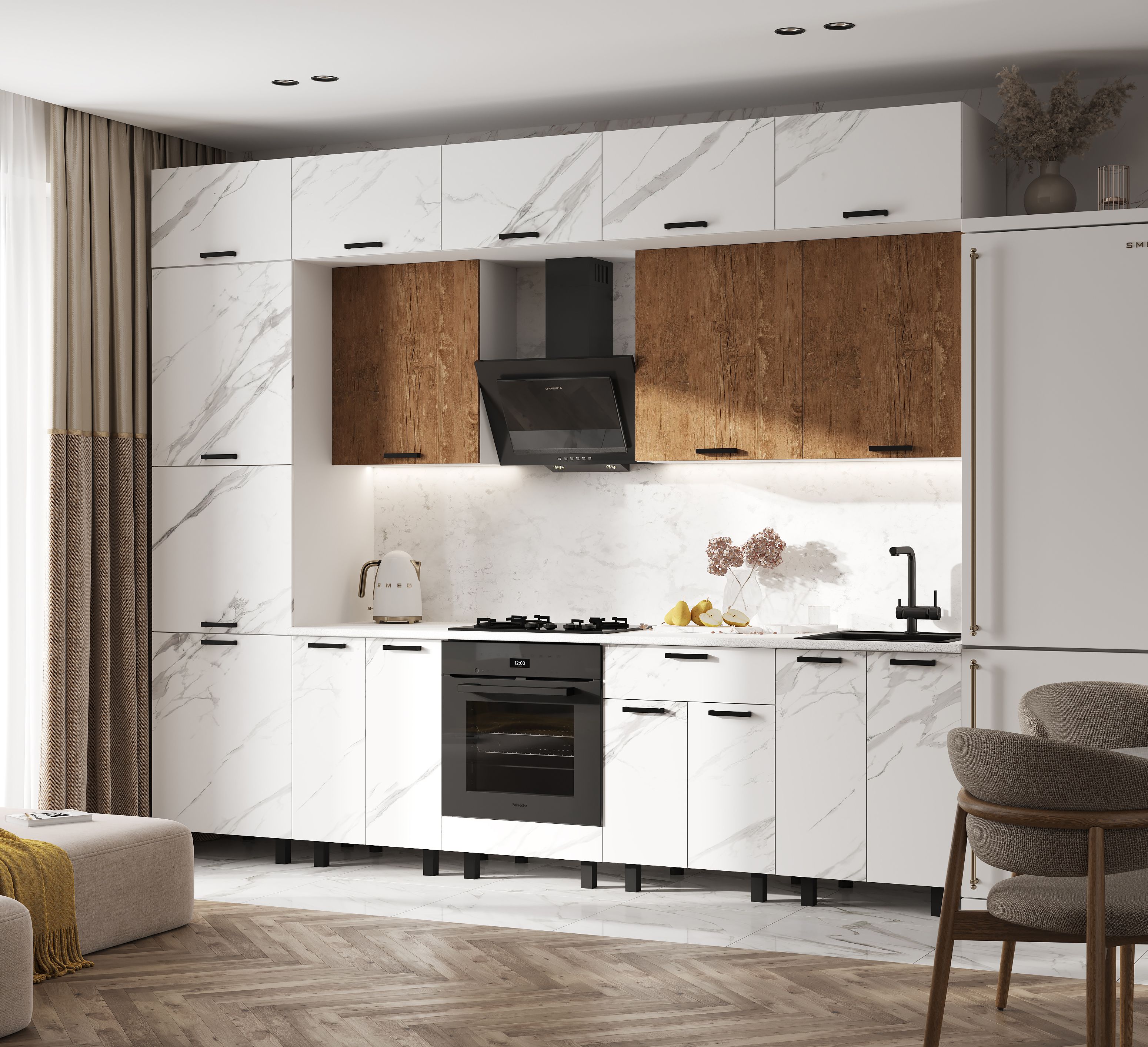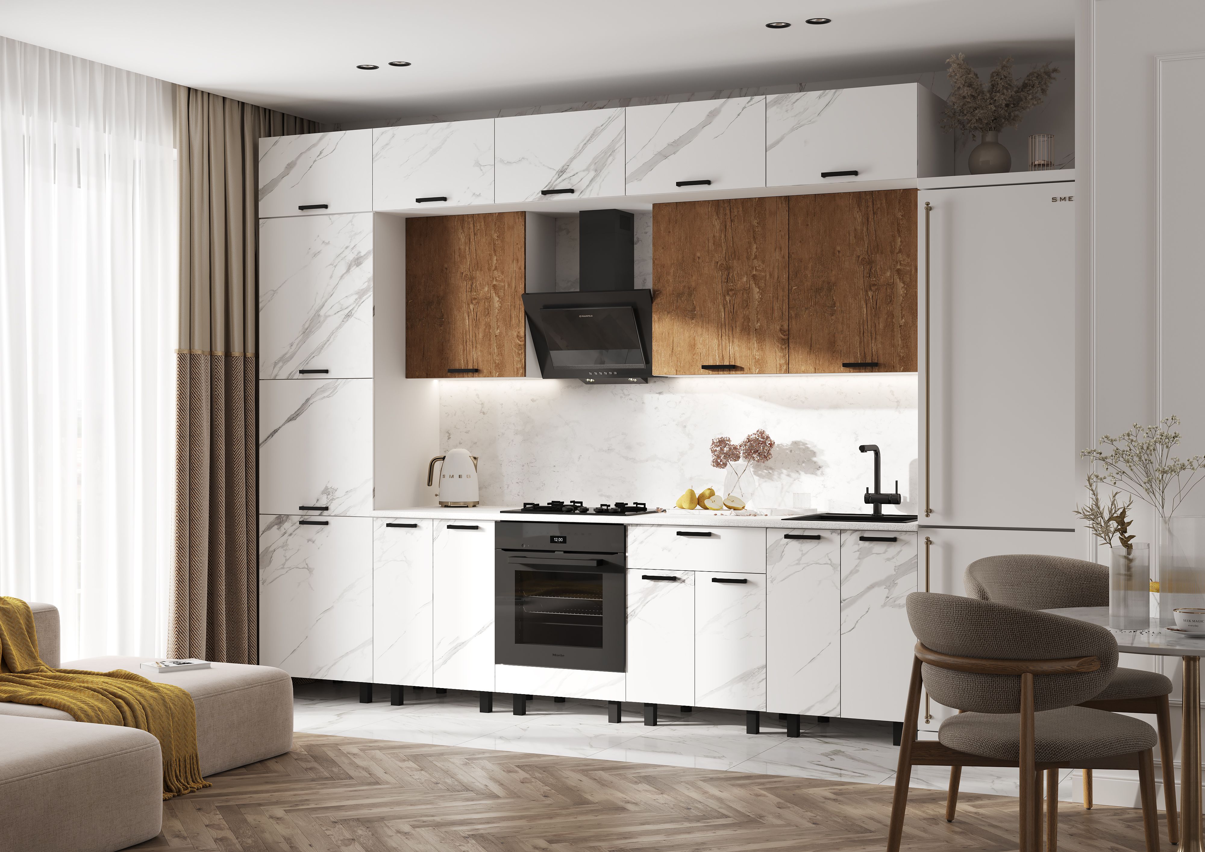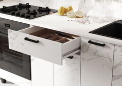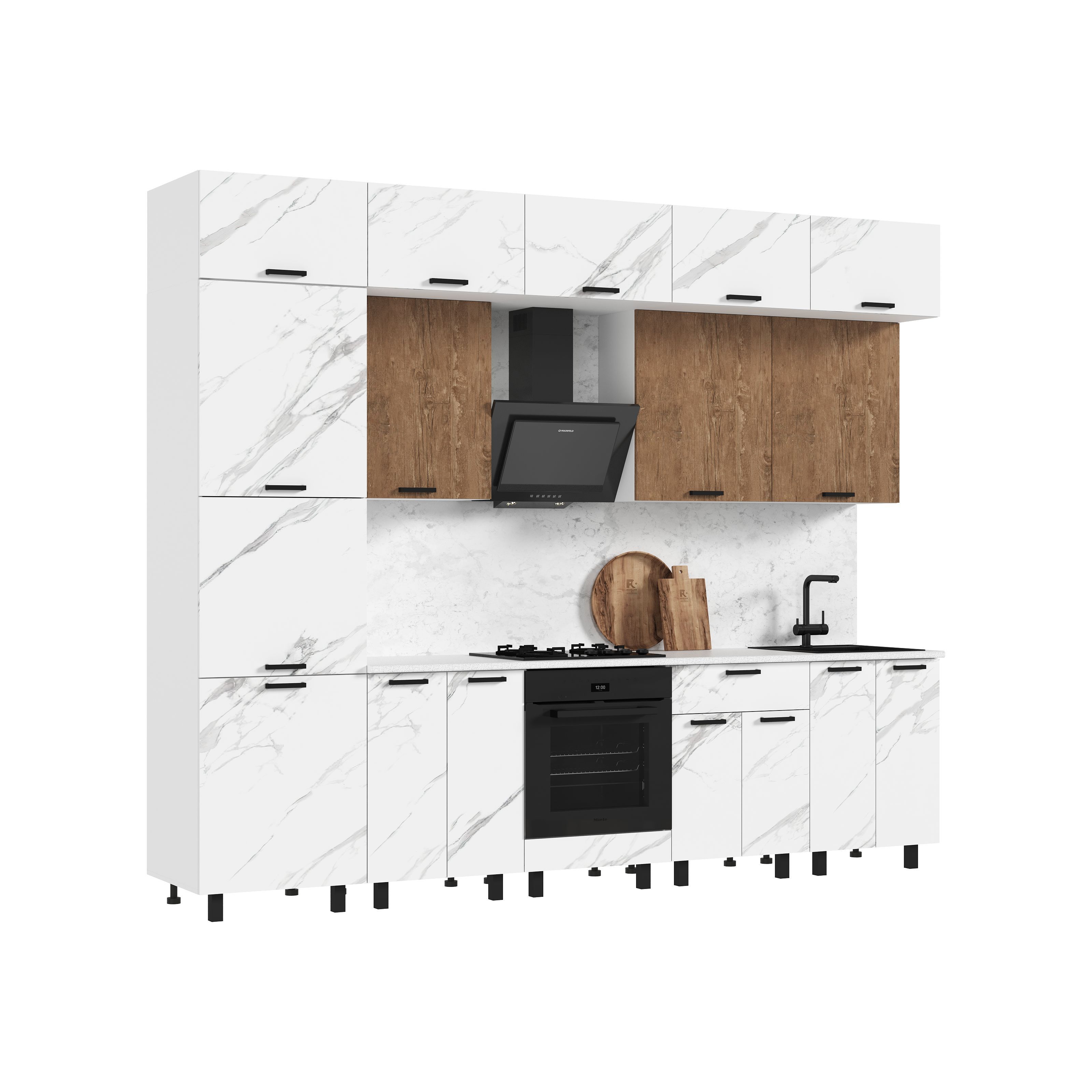 Стеновая панель (фартук), мойка, цоколь, карниз, подсветка, бытовая техника в стоимость кухонного гарнитура не входят и приобретаются дополнительно.