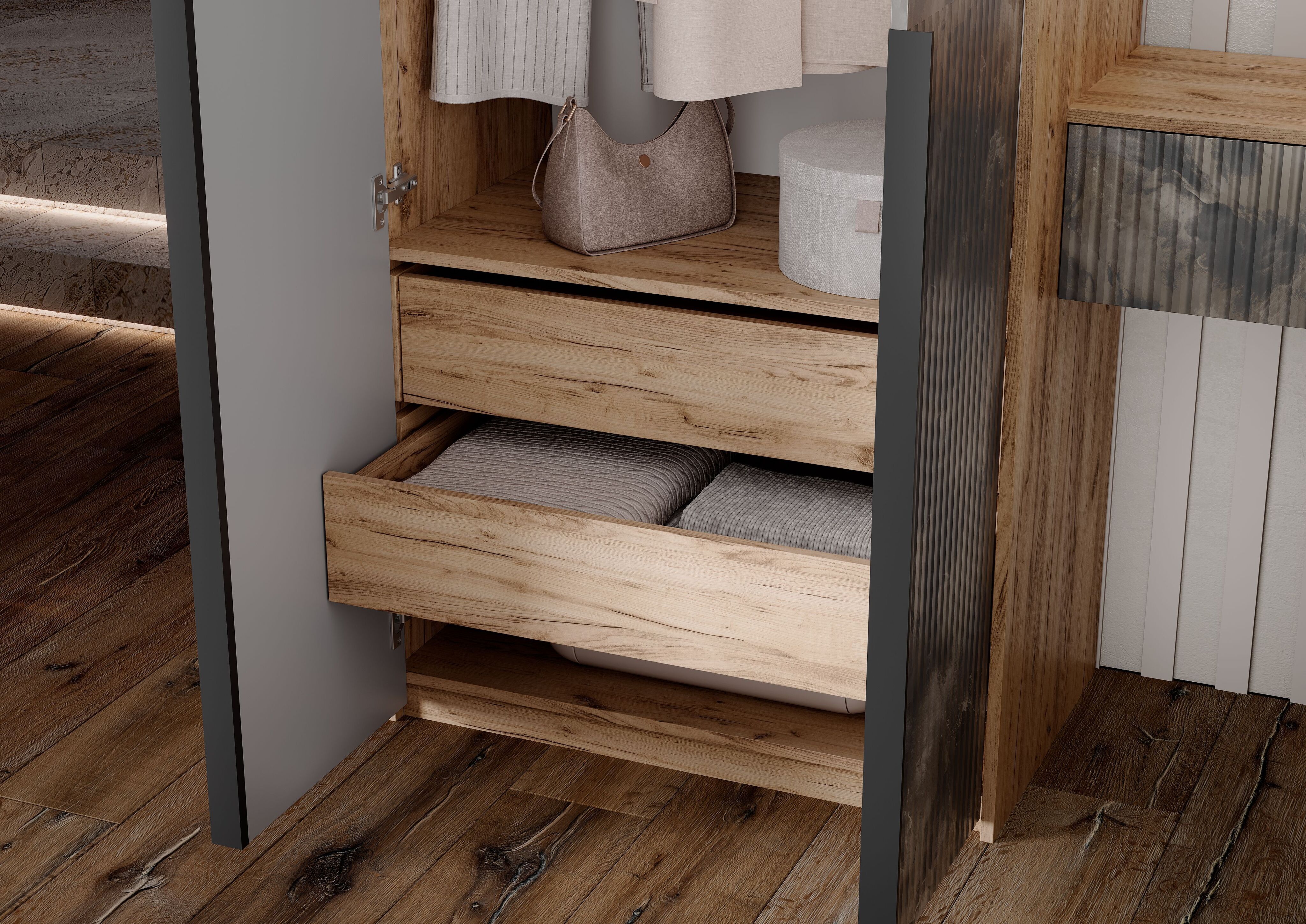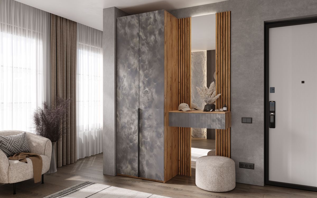 Марвэл Шкаф 2х. ств (доп ящики) и тумба с зеркалом (Мальта грей, Дуб Крафт)