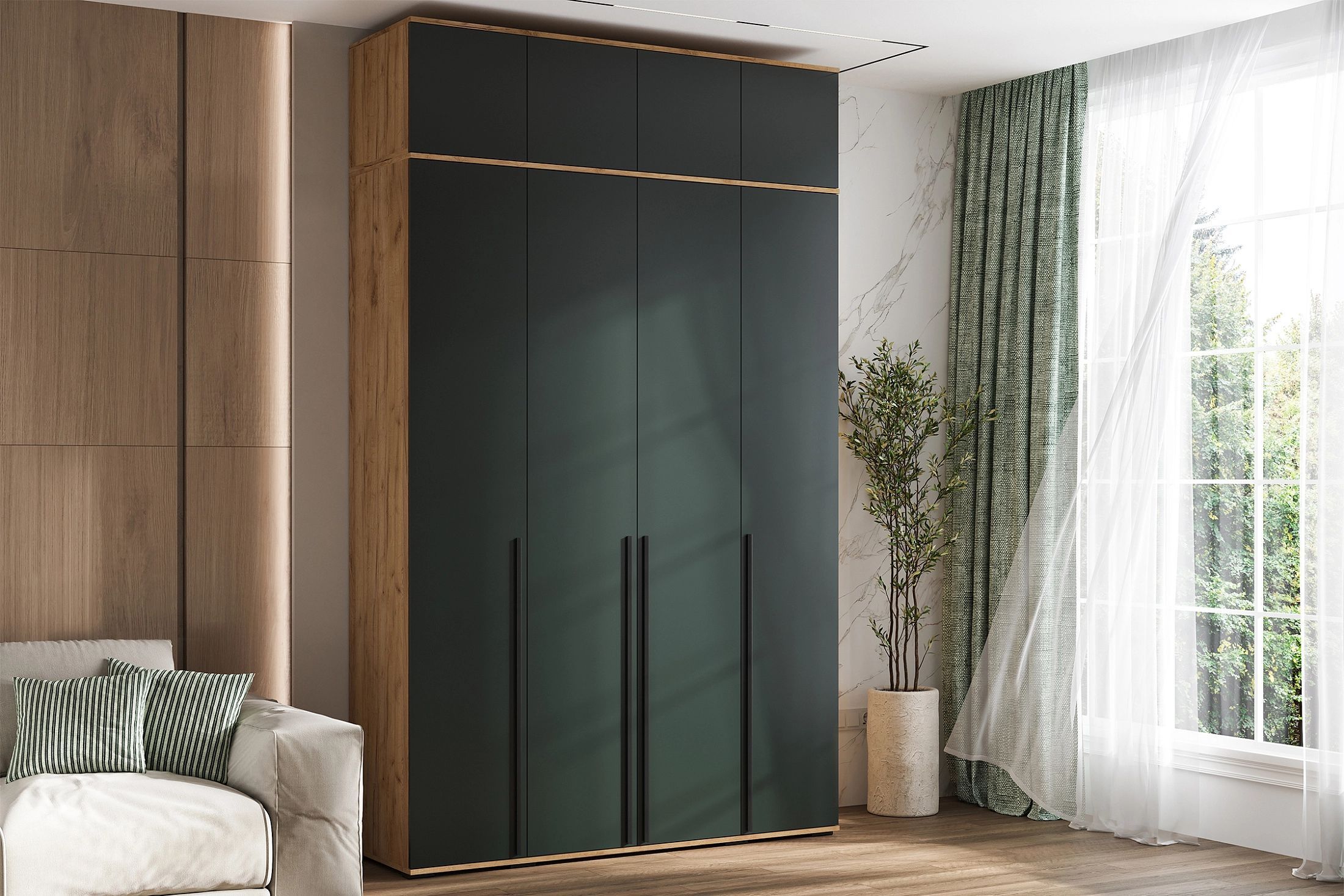 Норд Шкаф 4-х ств.(1600) с АНТРЕСОЛЬЮ (Изумрудный (КРОМКА ИЗУМРУД), Дуб Крафт)