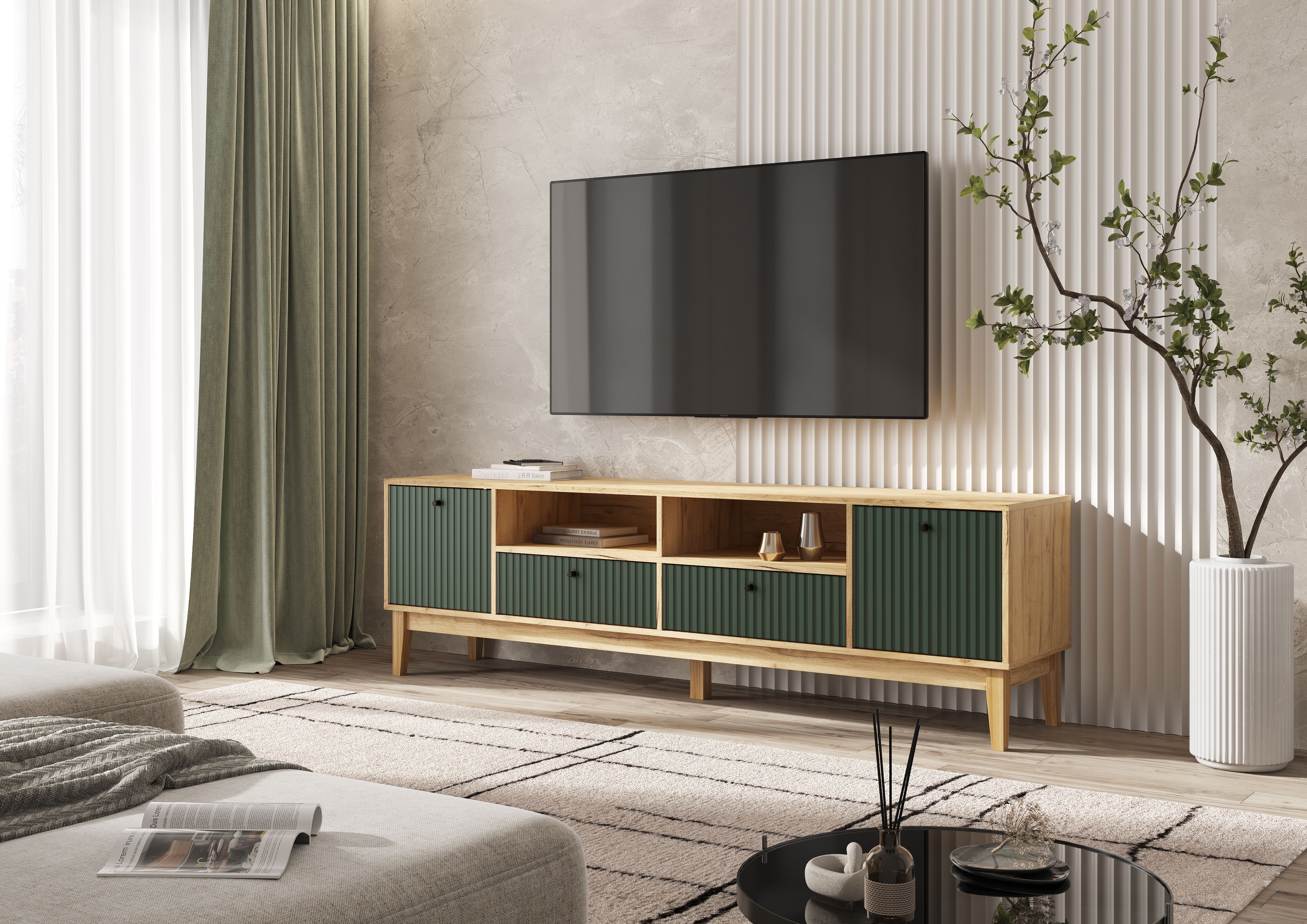 Оливия Тумба ТВ 2 двери 2 ящика (Браш Мени Грин, Дуб Крафт )